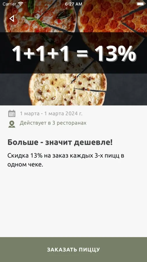 Мобильное приложение «3 Пиццы» для заказа любимых блюд с собой или на доставку в Санкт-Петербурге и Калининграде. Выбери, что ты любишь больше: пиццу на тоненьком тесте или пышное тесто, белый соус или красный, вкусные роллы, пасты, салаты, супы, а так же блюда собственного производства шоковой заморозки.