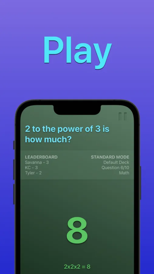 Grab some of your closest friends, cousins, or even strangers. Once you have some competition, open the application and hit play. Think of some fun names to use or be boring and use your real names while you embark on your trivia adventure. Tap to Start and you are off to the races! A default timer of 20 seconds will begin counting down (this can be modified in settings). When the timer runs out, simply hold up the correct digits to the group. It's that easy!