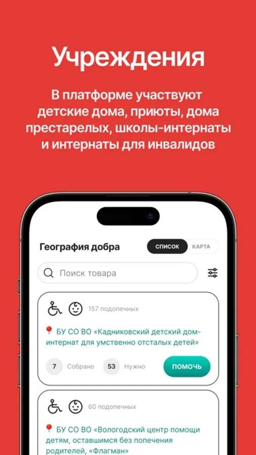 ⁃ В платформе участвуют детские дома, приюты, дома престарелых, школы-интернаты и интернаты для инвалидов;