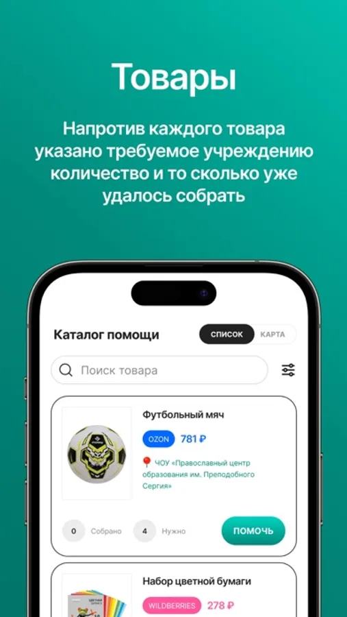 ⁃ В карточке товара указано требуемое учреждению количество и то сколько уже удалось собрать;