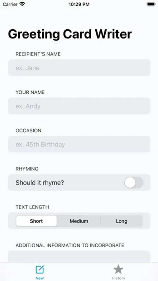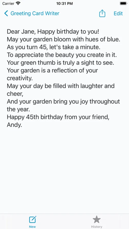 Writes a personalized greeting card message. Enter as much information you want to make the message even more personalized.