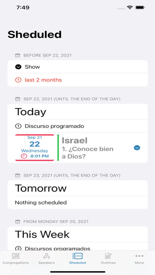 In this section you will see a filter of speaker assignments, either by week, next weeks, today or tomorrow.