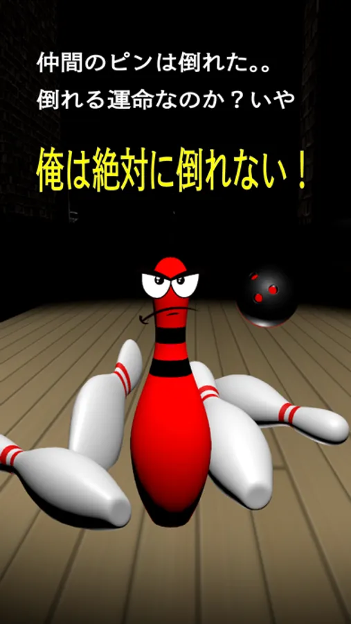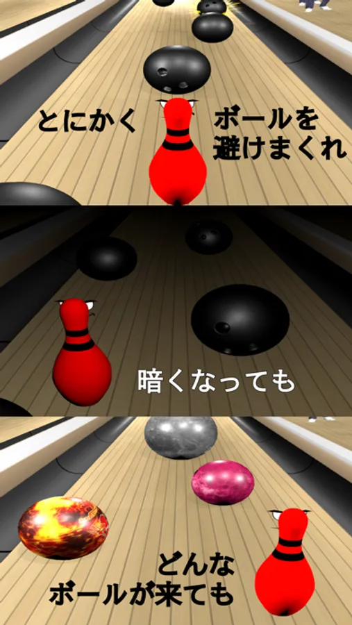 This app is a game where you control an indomitable bowling pin to dodge bowling balls from left and right. As you dodge more balls (score), the game level (difficulty) changes and the balls become faster/slower, the surroundings become darker, the balls start curving, and various types of balls start rolling towards you. Based on your score, you can obtain positive words (phrases) from the bowling pin. Stand up multiple times, dodge many balls, and aim for completing famous sayings!