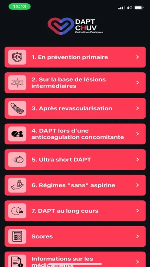 L’application DAPT CHUV vous guide dans la prescription de la double antiagrégation plaquettaire (DAPT) la plus optimale pour votre patient selon les guidelines en vigueur au Centre Hospitalier Universitaire Vaudois (CHUV).