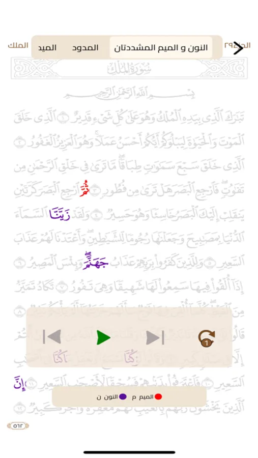 ثم يختار المتعلم حكما تجويديا سهلا في البداية : كالنون والميم المشددتين ، مع الاستماع لها والتدرب على نطق أمثلتها. (يكرر ذلك عدة مرات)