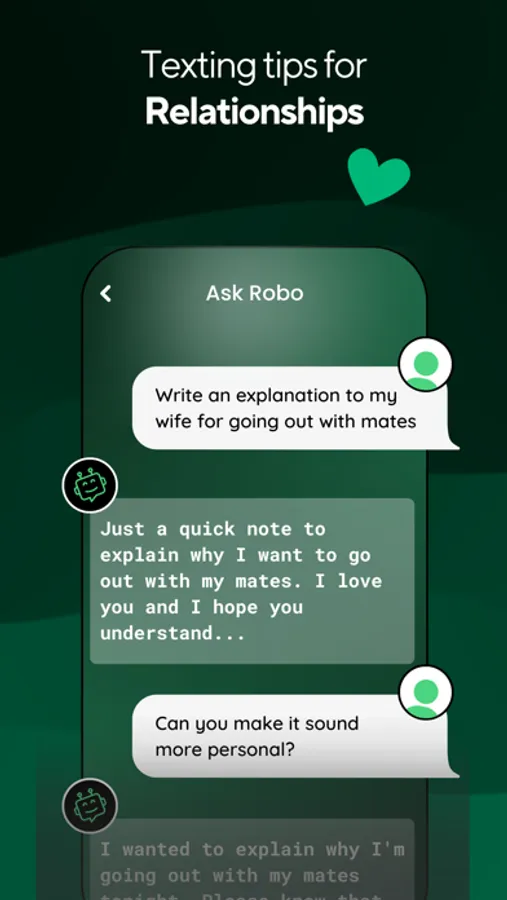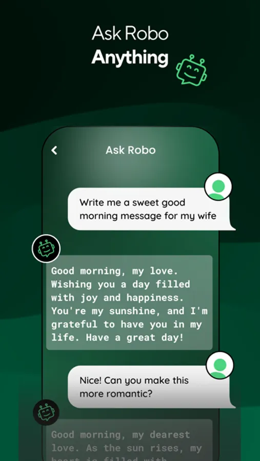 Experience the delight of conversing with a friend through Ask Robo. With its friendly and conversational tone, personalized recommendations, and expert suggestions, you'll find yourself engaged in meaningful conversations, both lighthearted and profound.