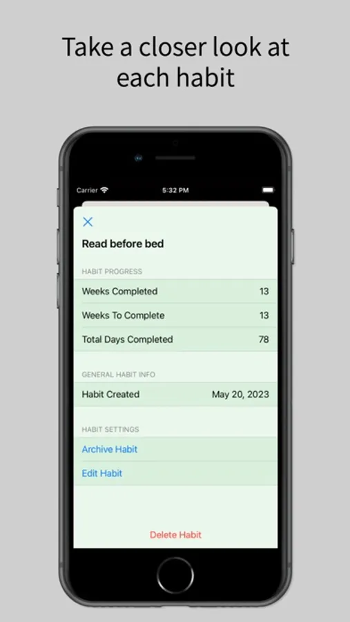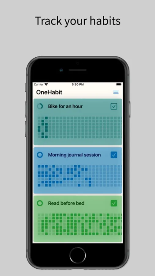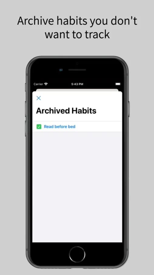 OneHabit understands that what you want to track can change over time. With the archive feature you can easily remove habits you no longer want to track while keeping a record of your progress.