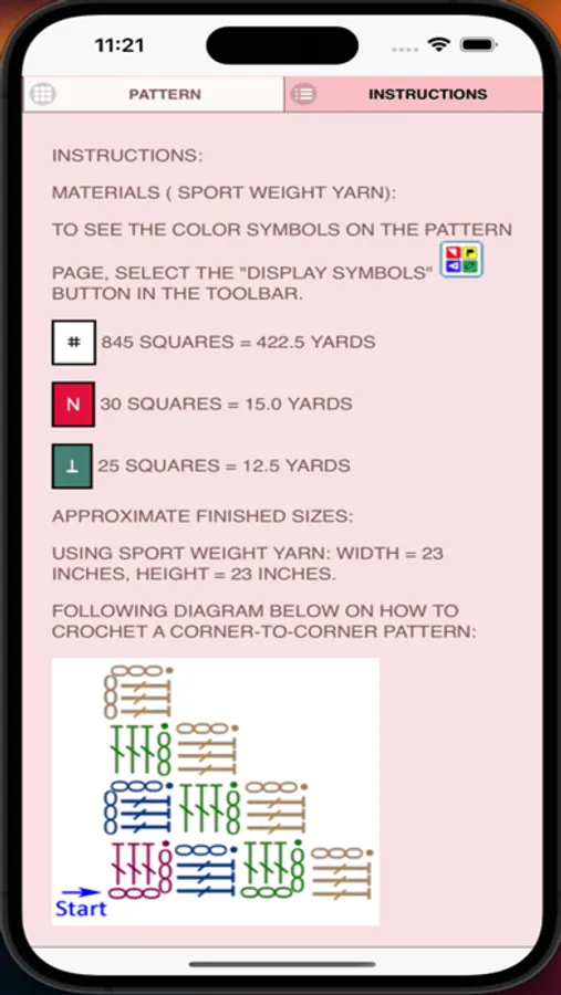 Create Crochet Graphghan patterns on your mobile device. Written graphghan crochet instructions are automatically generated for your graphghan crochet patterns. Included are the amount of thread/yarn needed and approximate finished sizes for your graphghan crochet pattern.