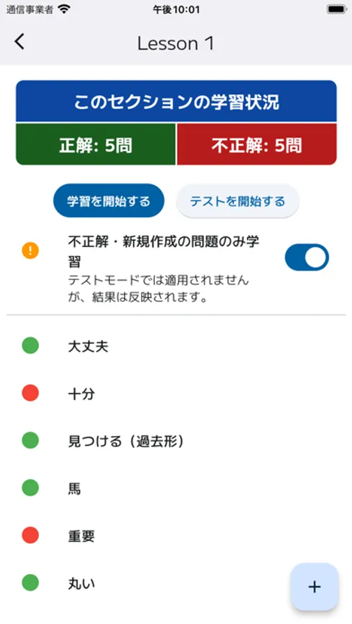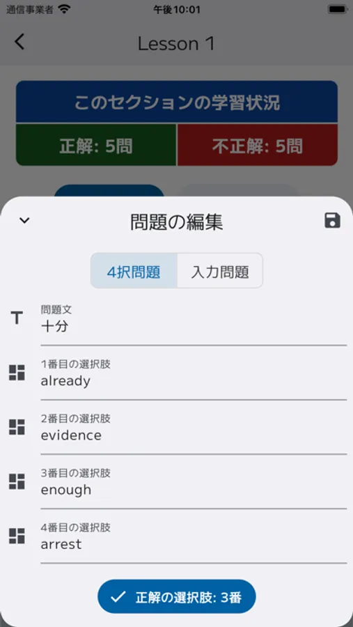 問題形式は4択問題か入力問題で、不正解だった問題に絞って復習できる学習モードや、ランダムに出題されるテストモードもあります!