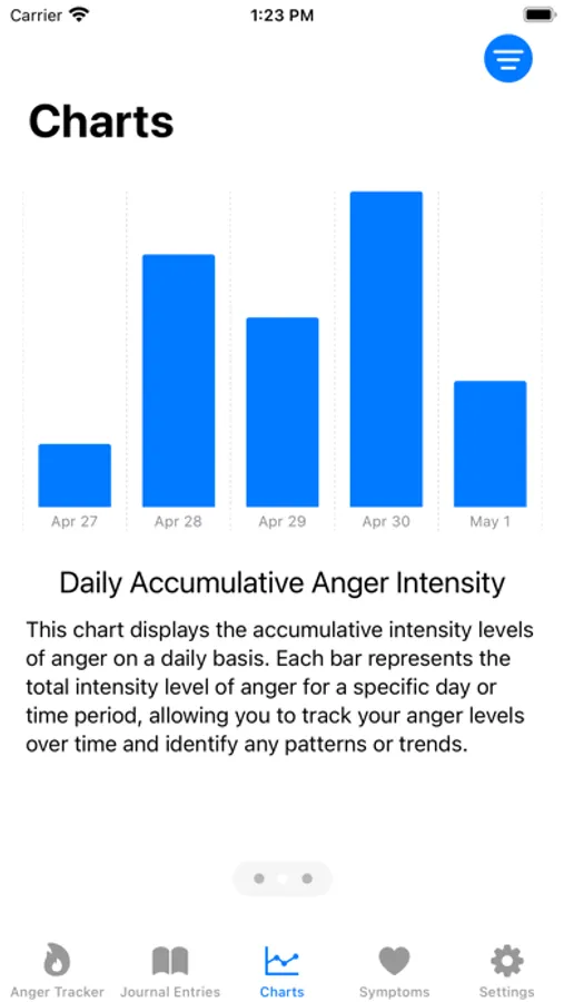 Daily Accumulative Anger Intensity Chart: Get a daily summary of your anger intensity levels and see how they compare to previous days.