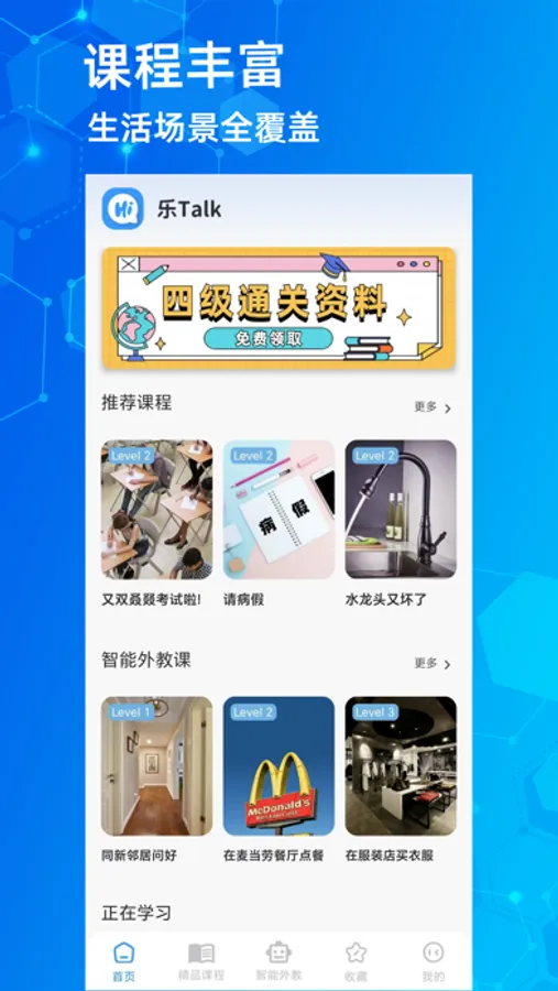 分等级设计课程内容,每课内容均以现实生活场景为主题,包含词汇、语法、表达句式等基础知识学习,同时通过对话练习和角色扮演,提升实际口语表达能力。