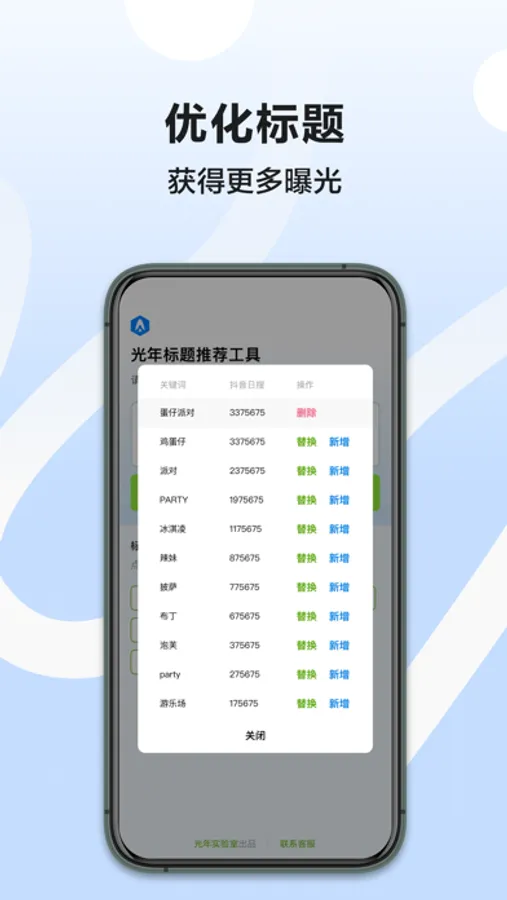 光年商品标题优化工具,专业提升商品链接的曝光率。输入商品标题,AI智能分析关键词,提供50个相关词汇,支持相关度和抖音日搜索量排序,轻松选择和替换。优化后的商品标题,让你的商品在抖音上更有竞争力。光年商品标题优化工具,抖音电商必备神器,快来下载吧!