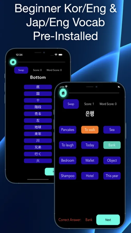 Quiz All is set up for Beginner English/Korean, and Beginner English/Japanese Vocab. *