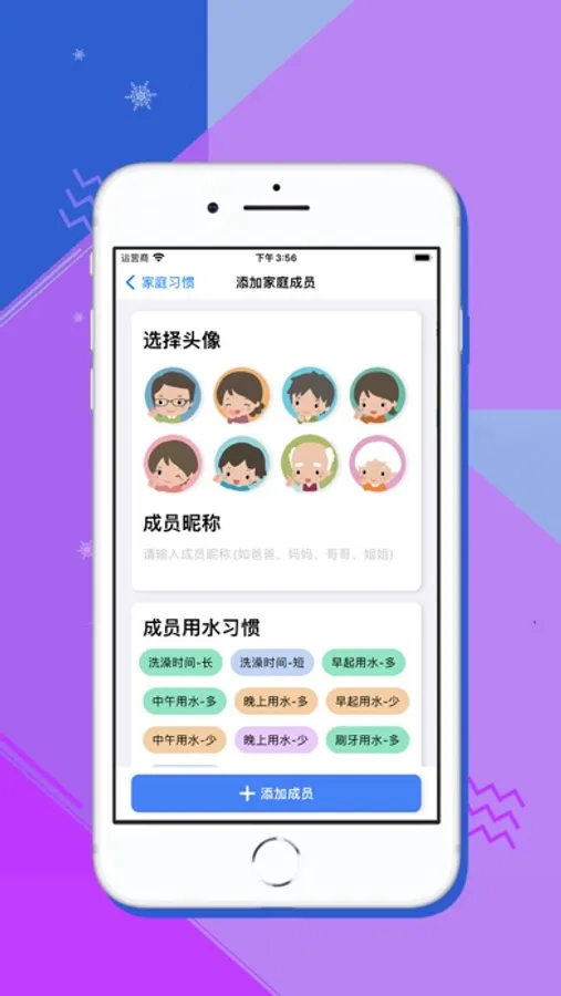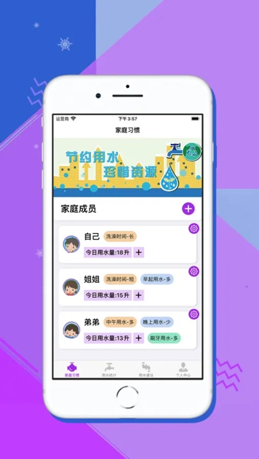 · 家庭成员:添加家庭成员身份、用水习惯、每日用水配额。