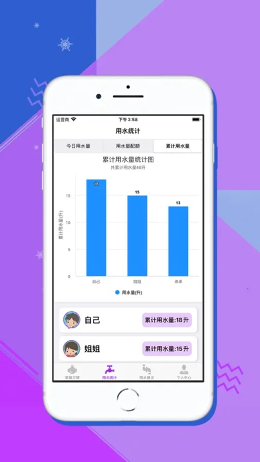 · 用水统计:以图表方式展示家庭成员每日用水占比及配额使用情况。