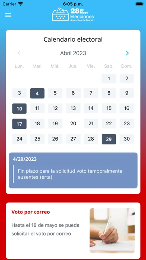 “Elecciones Madrid 2023” es la aplicación oficial y gratuita que la Comunidad de Madrid pone a disposición de los ciudadanos para consultar información preelectoral acerca de la elección y ayuda para los votantes y durante la jornada electoral se podrán seguir los resultados provisionales de las elecciones a la Asamblea de Madrid del 28 de mayo.