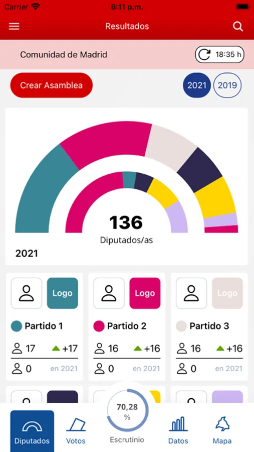 El día de la elección permite consultar en tiempo real los datos de constitución de mesas y avances de participación, así como los resultados provisionales obtenidos por todas las candidaturas por ámbito geográfico (Comunidad, municipios y distritos). También permite agrupar candidaturas para estudiar posibles composiciones de la Asamblea y seguir las ruedas de prensa en directo.