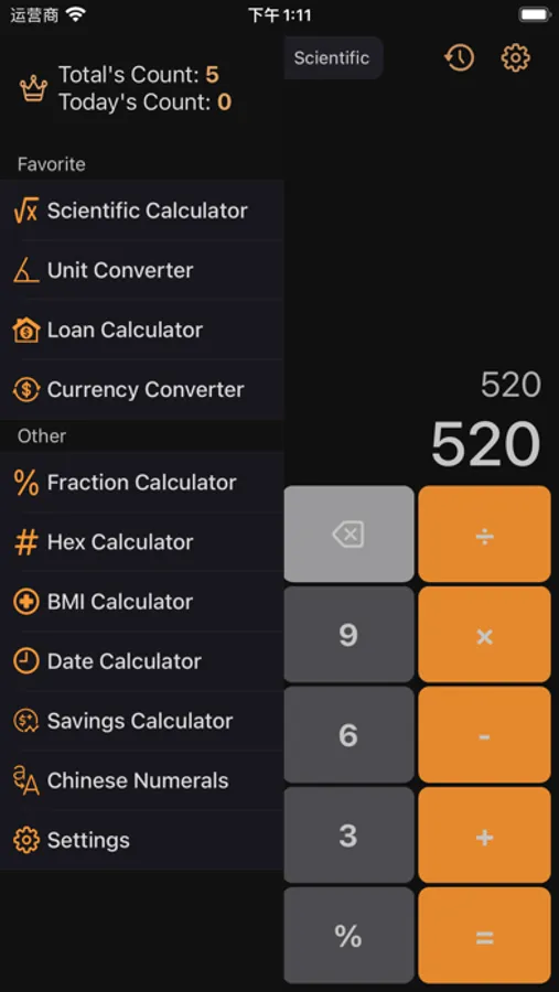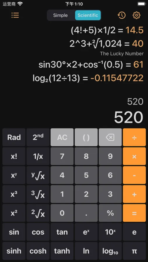 ▸ Scientific Calculator (e, pi, π, Sin, Cos, Ln, X!, ^, √, log, Sin⁻¹, Cos⁻¹, …)