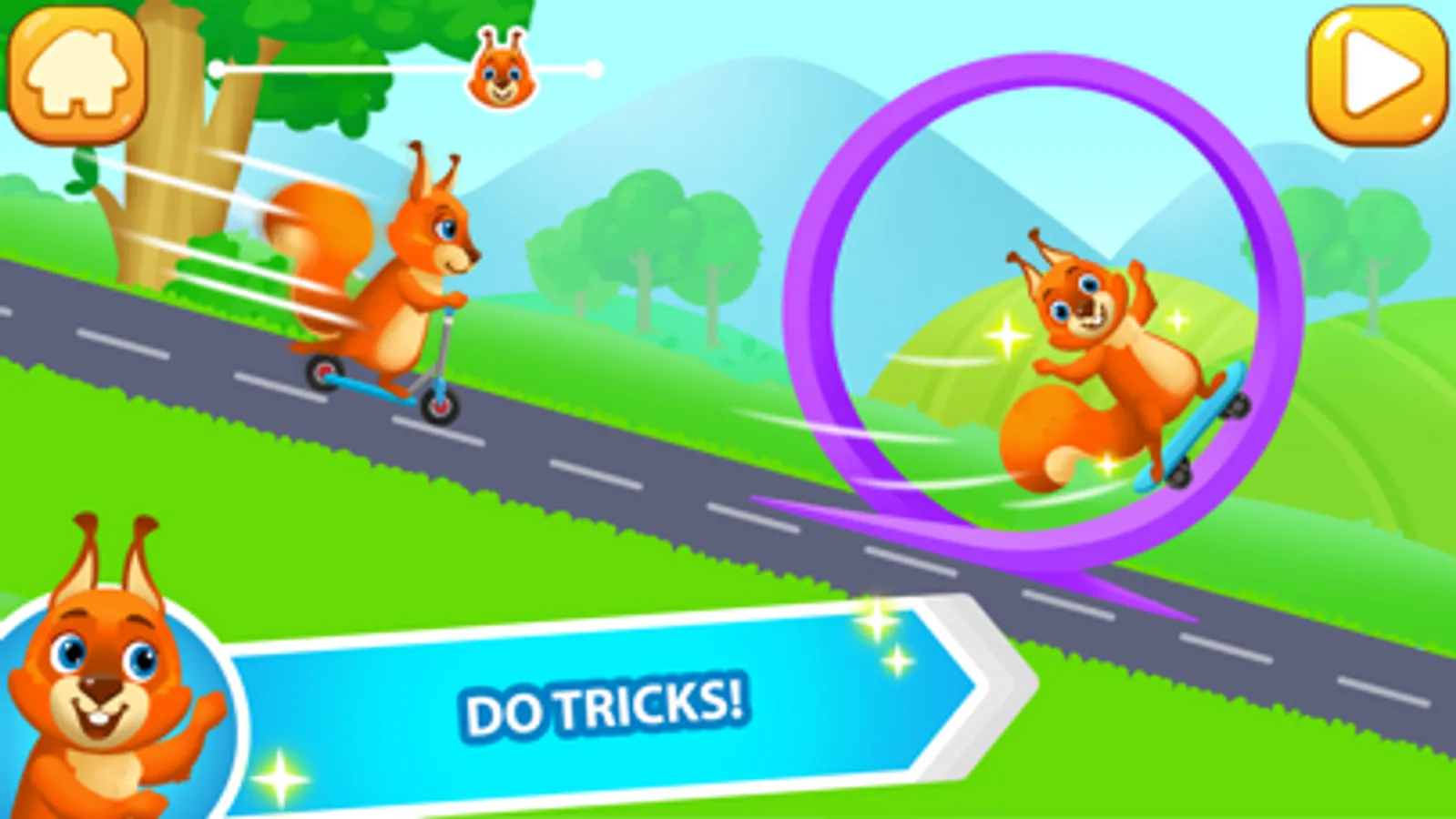 At the beginning of the race your child has to choose a transport for the Squirrel-rider. The kick scooter is available by default yet if little players wish to upgrade to a longboard or a wagon, they can pay for it with golden hazelnuts. The good news is, golden hazelnuts are easy to get - they can be earned by visiting the game regularly or completing levels, so your child can enjoy the game without breaking the bank!
