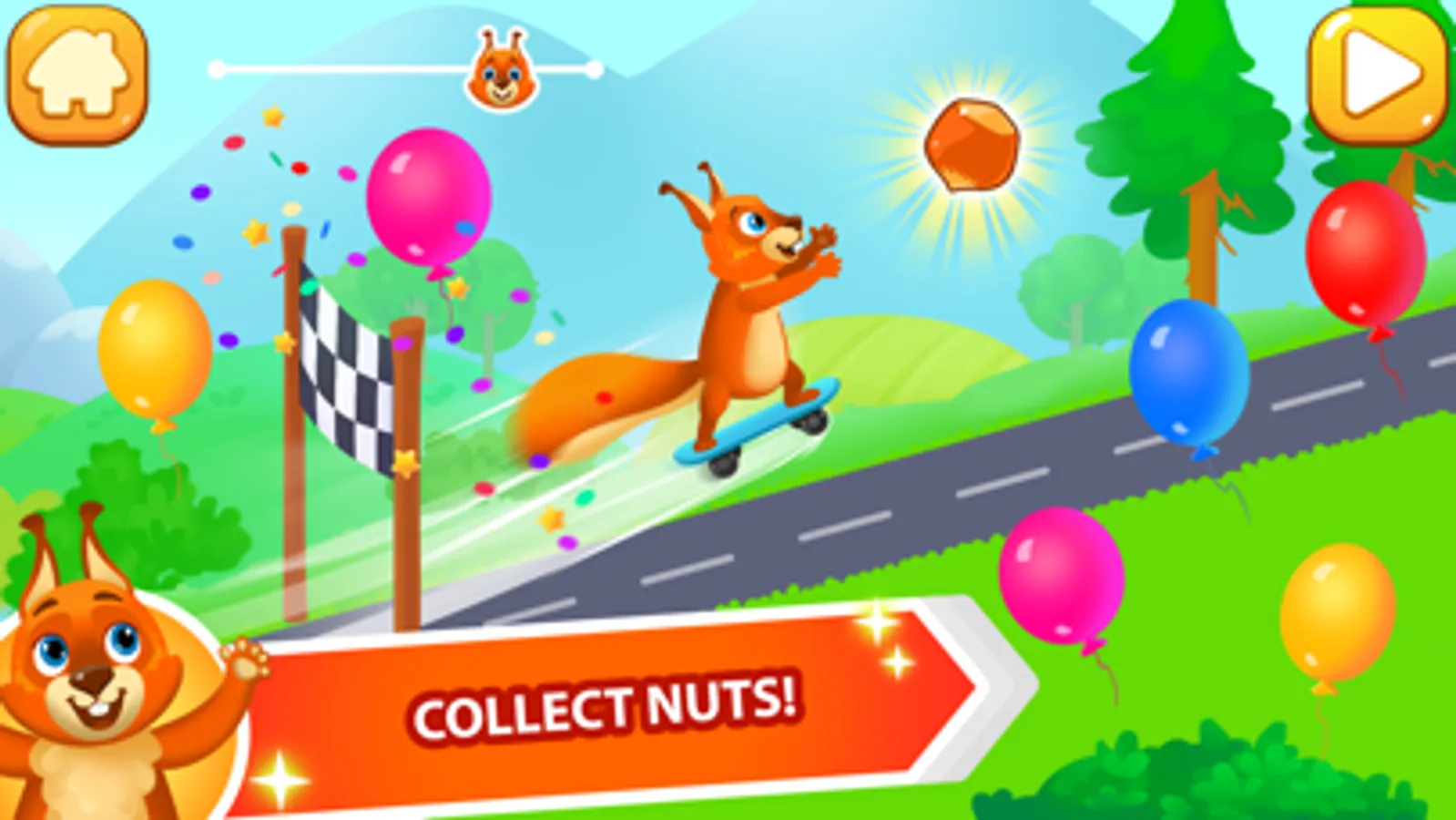 And what about kids learning? There are numbers from 0 to 9 scattered along the route, and the Squirrel should catch them all to get the ultimate bonuses. Your child will love learning numbers in this playful and entertaining form! Live hilarious colorful numbers, they are laughing and waving to you! The Squirrel race will certainly spark kids’ curiosity, boost their cognitive skills, develop fine motor skills and make learning a fun and exciting adventure!