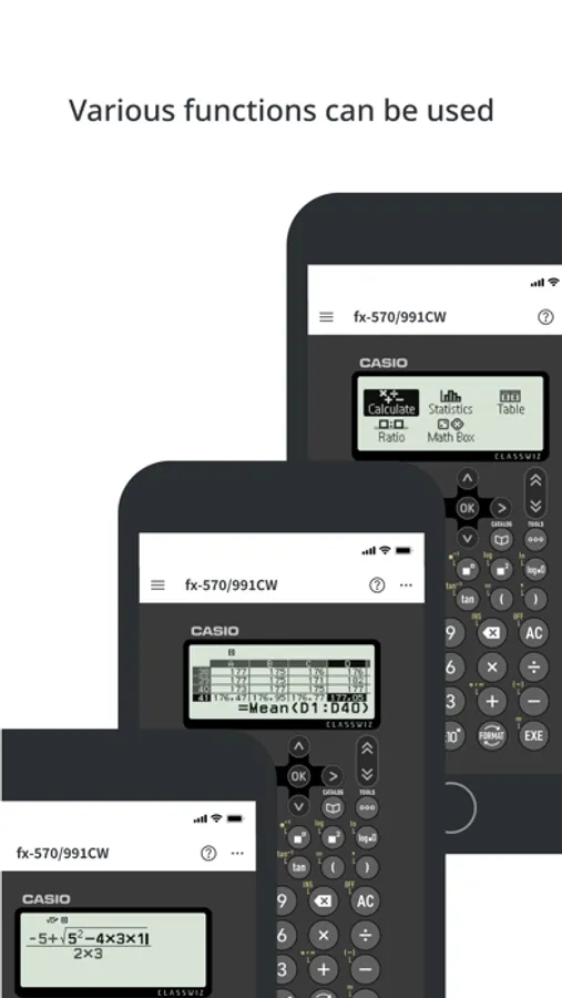 Through this app, users can use a wide range of ClassWiz functions with ease. This includes statistical calculations, spreadsheets, matrix calculations and graph display functions through ClassPad.net connectivity.