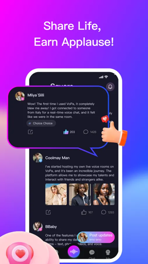 VoPa is also your go-to platform for sharing day-to-day moments, amusing stories, or any other aspect of your life that you'd like to showcase. With options to share in text, photo, video, or voice form, the app offers a dynamic space to express yourself freely. Friends can interact with your posts, leave comments, and share your moments. This feature not only strengthens the bond with your existing friends but also attracts other like-minded users to your profile.