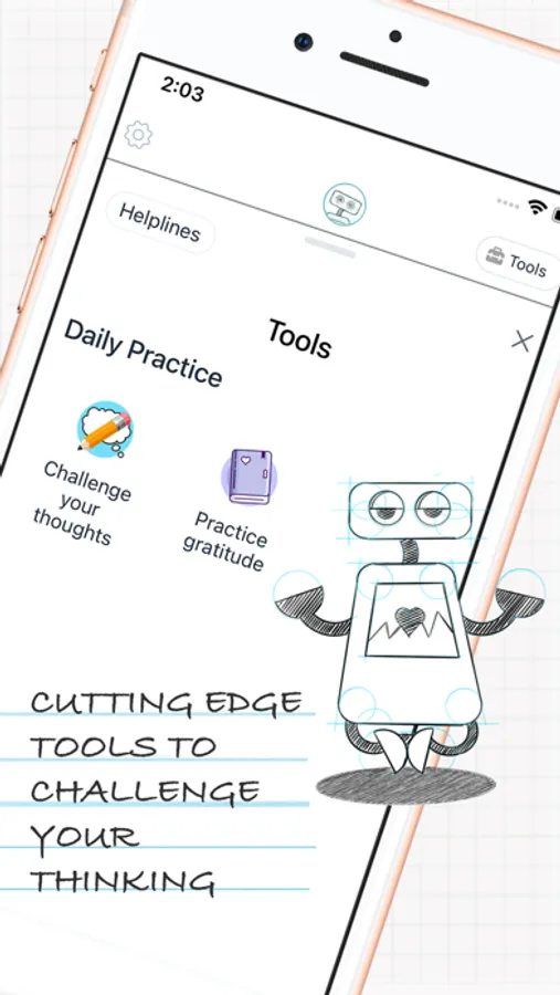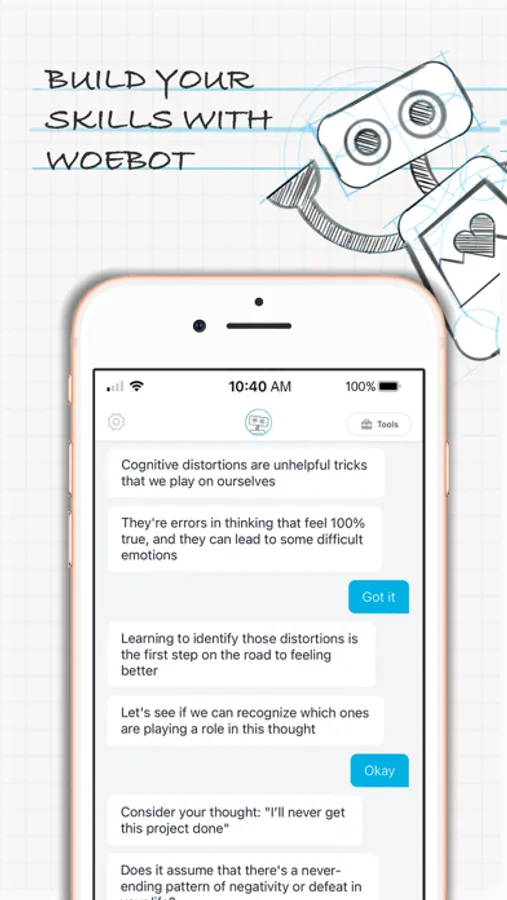 The BUILD app aims to support your mental health through a relational agent called Woebot. Woebot starts by asking you a simple question: how are you doing? Your answer starts a private conversation with Woebot. Whether you’re feeling anxious, overwhelmed, mad, or just want to talk, Woebot adapts to give you what you need depending on how you’re feeling. You’re offered specific tools similar to the ones you might learn about in therapy with a person - such as learning to challenge your thoughts and practicing gratitude.