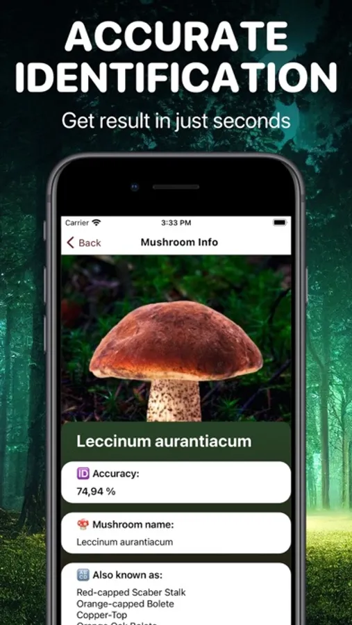 Identifying mushrooms has never been easier with user-friendly and intuitive Mushroom Identifier App. Just snap a photo of the mushroom you want to identify or choose a mushroom photo from the gallery. Get fast and accurate identification result with detailed info about identified mushrooms, such as: Accuracy, Mushroom name, Edibility, Taxonomy, and more.