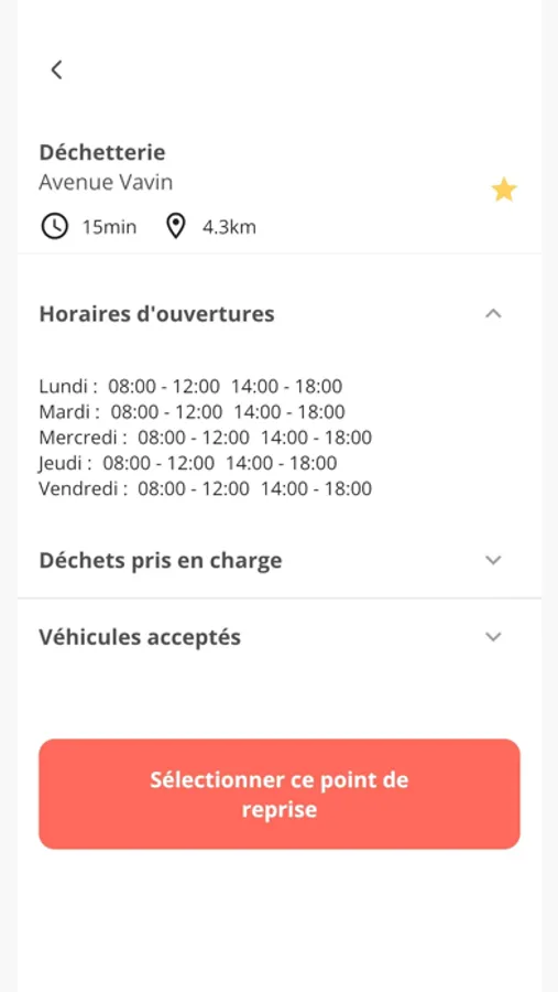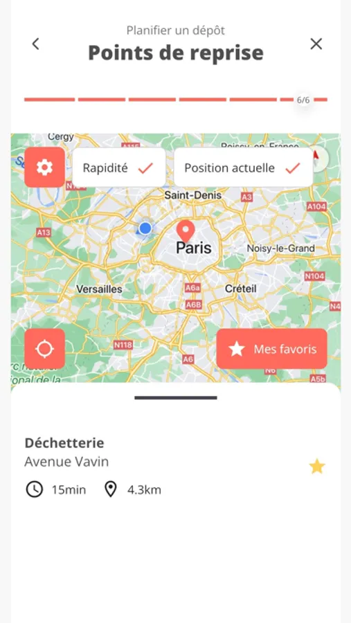 - Choix du point de reprise, parmi les lieux proposés par l'application, ou parmi les points de reprise favoris.