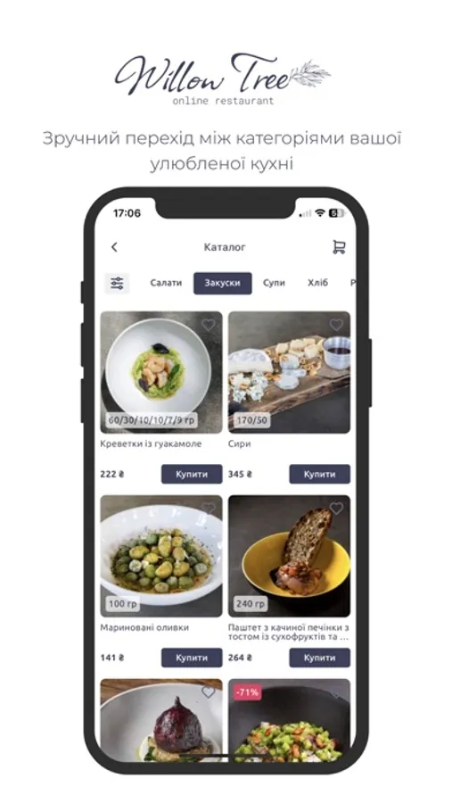 Додаток Willow tree дозволяє вам переглядати каталог закладу, оформлювати онлайн замовлення на доставку і самовивіз, стежити за акціями та новинами, відправляти відгуки про роботу закладу та доставки, а гнучка система лояльності з можливістю накопичувати бонуси та отримувати знижки стане в нагоді тим хто полюбляє заощаджувати