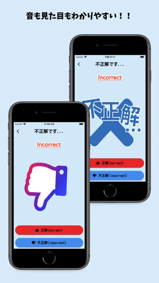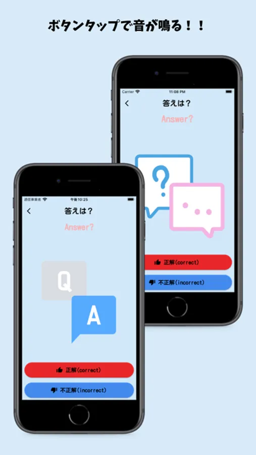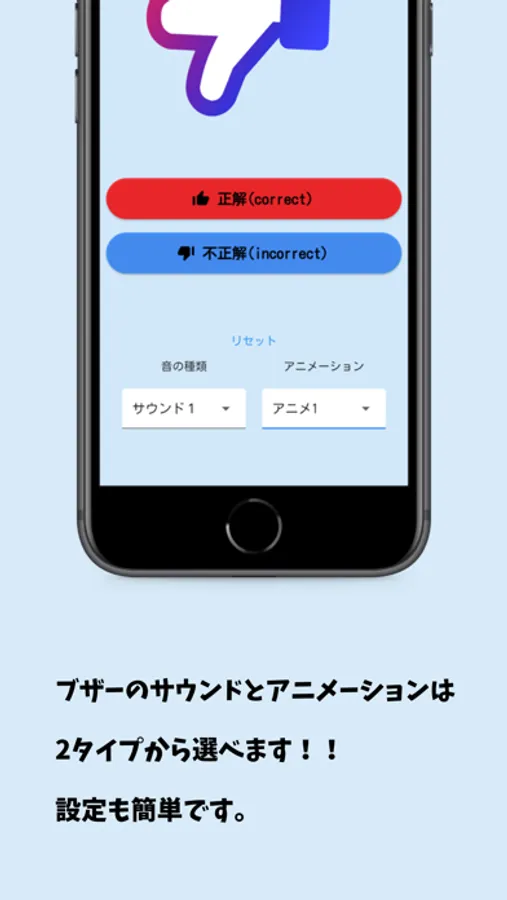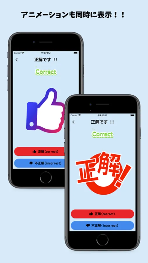 正解、不正解のボタンをタップするだけで効果音とアニメーションを表示します。
