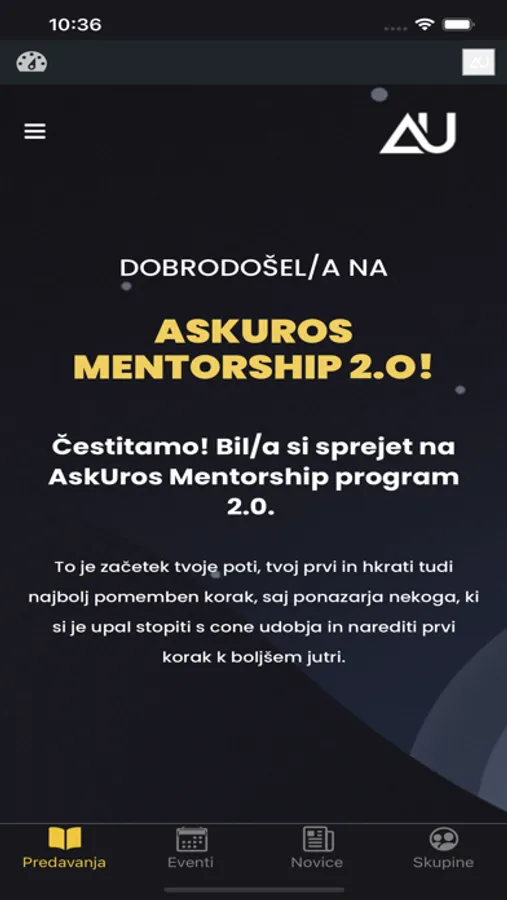 Uradna aplikacija za AskUros Mentorship program. Na aplikaciji boste lahko spremljali celoten Mentorship program, se prijavili na evente, se pogovarjali s sošolci in pletli nove poslovne vezi.