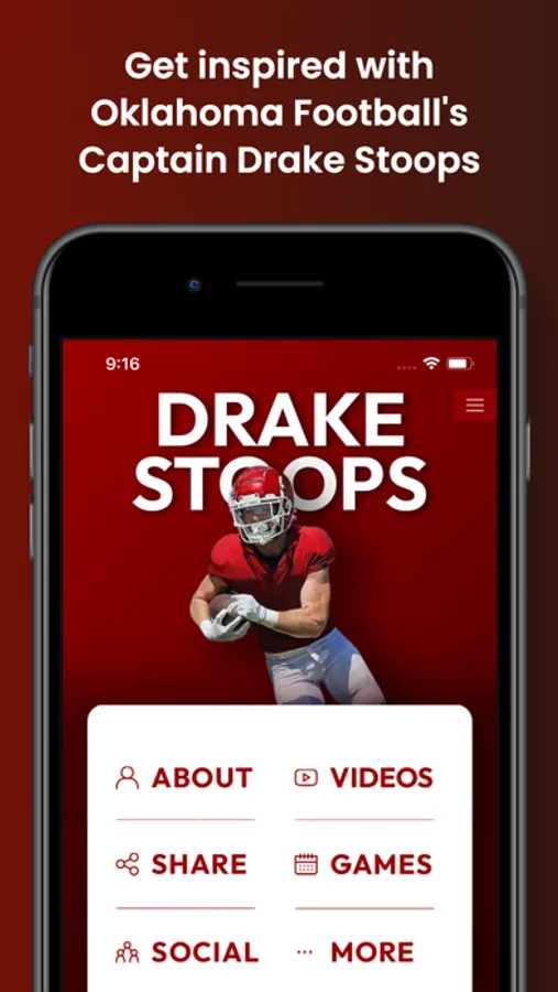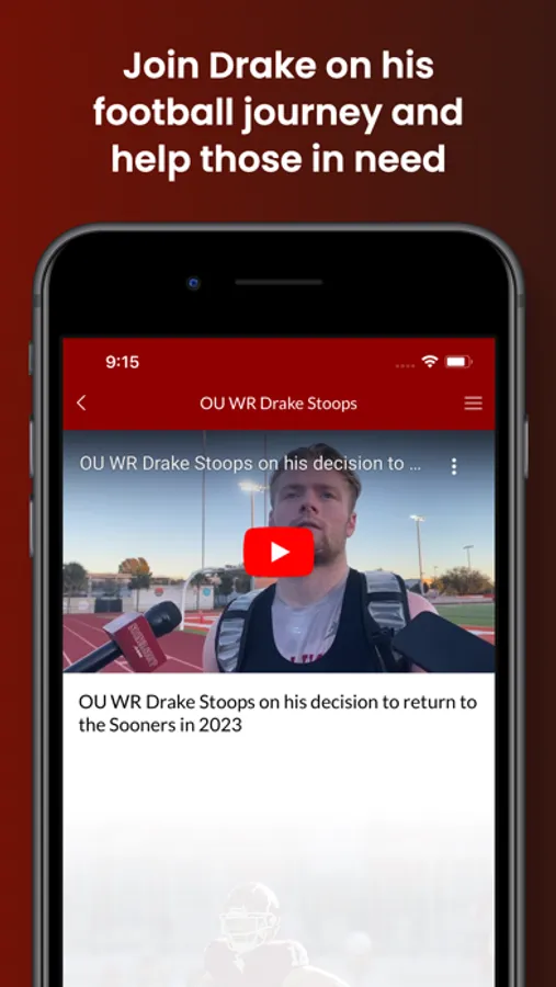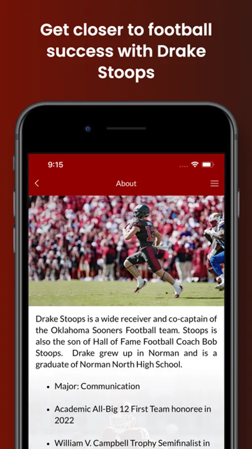 Drake Stoops is a Captain of the Oklahoma Football Team. He's the son of Hall of Fame Football Coach Bob Stoops. Download his app to learn more about Drake, his passion for football and helping others!