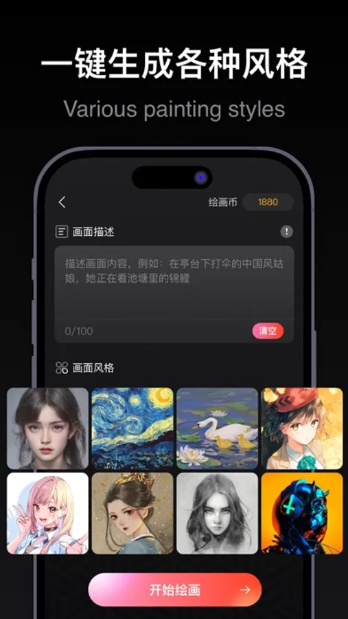 AI绘画是一款用户通过输入描述,自动生成绘画的创作工具