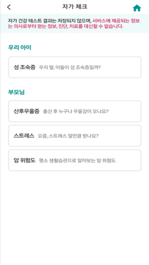※ 본 앱의 자가건강테스트 등의 결과는 의사로부터 얻는 정보, 진단, 치료를 대신할 수 없습니다. 직접 병원을 방문하여 의사 선생님을 뵙고 정확한 진료와 자세한 상담을 받아보시기 바랍니다.