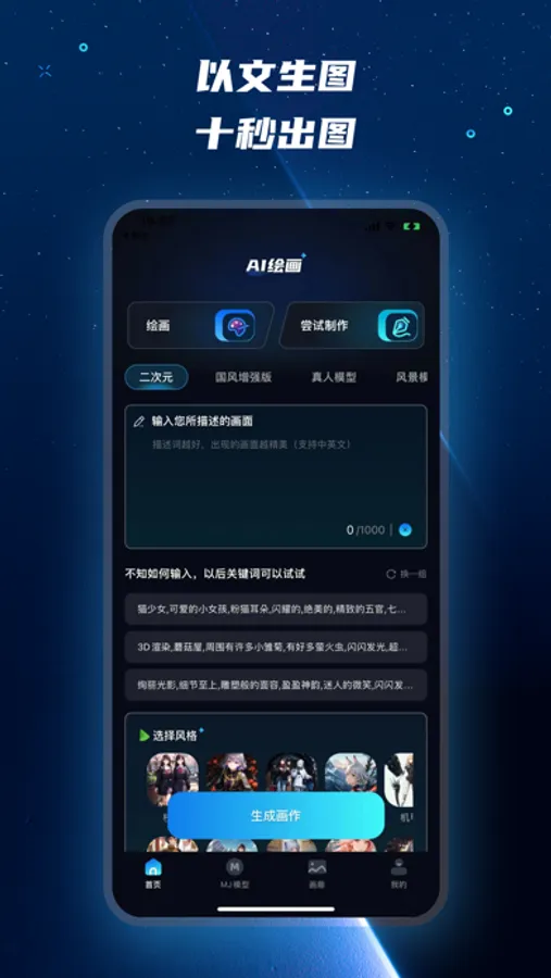 Mj绘画大师只需要通过简短的描述,即可生成梦境般的画作。基于强大的AI智能技术,AI智能就可以快速地将您输入的文字,