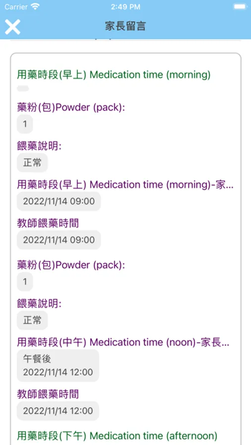 8. 托藥單 : 家長填寫委託老師協助餵藥,可簽名和回覆餵藥情況。