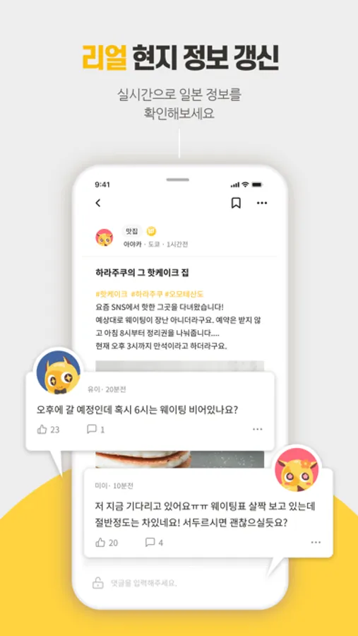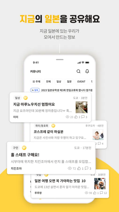 실시간 일본정보, 현지맛집, 여행경비, 일상, 질문 등 다양한 정보를 공유해요.