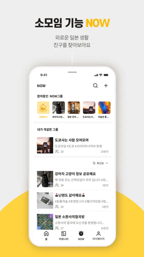 NOW : 같은 취미나 같은 생각들을 공유할 수 있는 커뮤니티안의 소모임기능이에요!