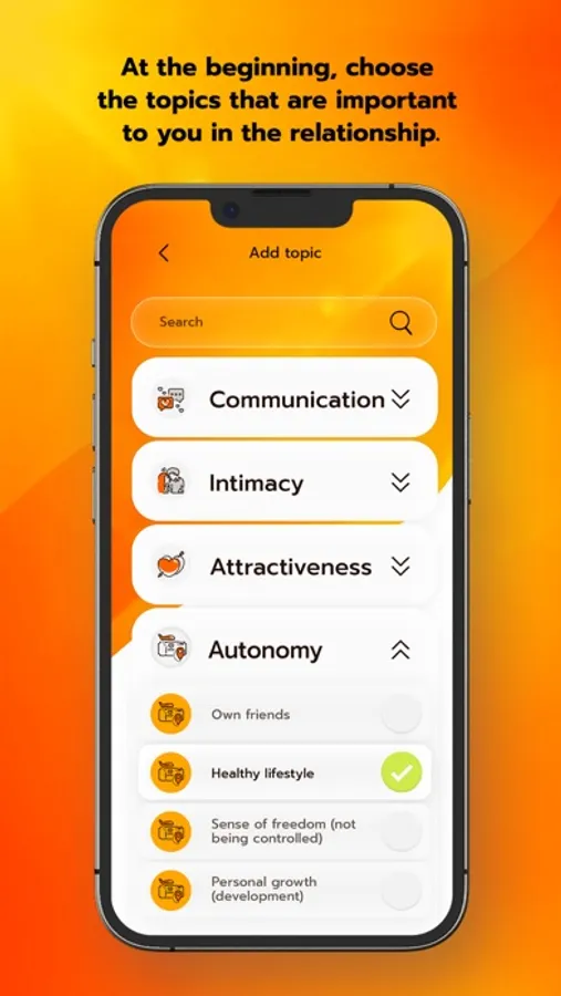 At the beginning of the registration you choose the topics that are important to you in your relationship. You can choose from the following areas: communication, intimacy, attraction, personal space, functioning together, overcoming obstacles, time together. You will then indicate how happy or unhappy you are with these topics and whether and how much your relationship is threatened by your partner's behaviour.