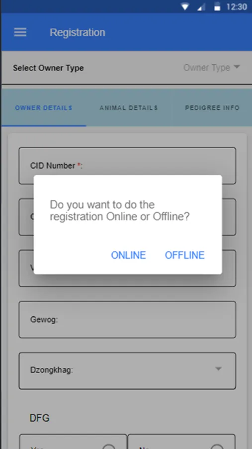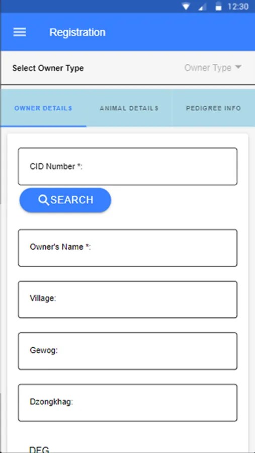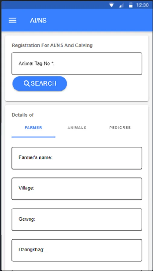 The purpose of this app is for collecting the information of the farmers and animals. The user registers themselves as surveyors and then goes to field. The user inputs the farmers identity number for fetching general informations and then registers the animals. This is for general public use. The app lets the user register themselves as surveyor and use the app to register the farmer and the animal. There is no payment method in this app