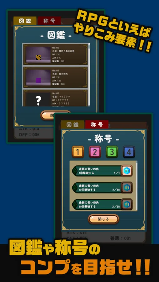 やりこみ要素として四角図鑑や称号システムも搭載!!
