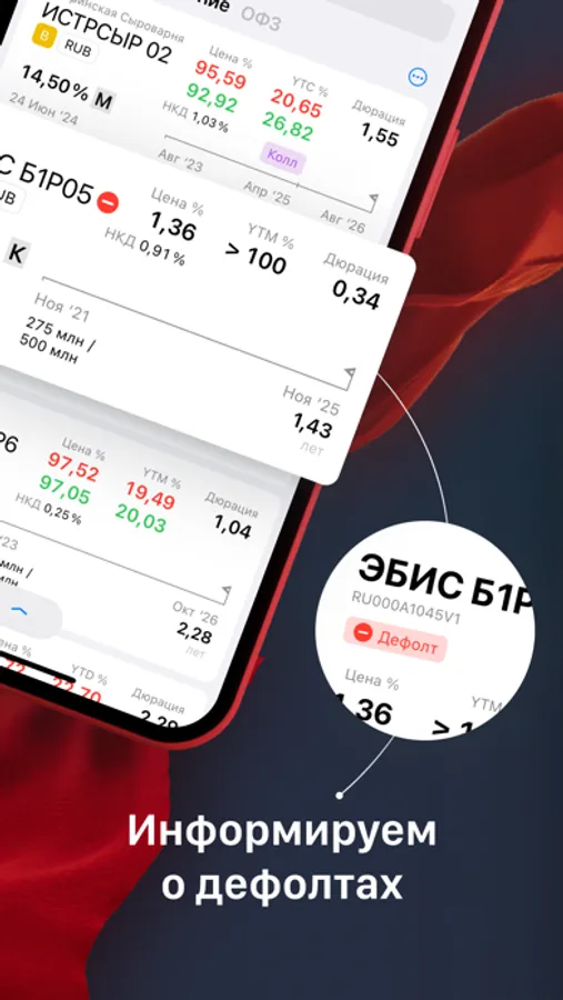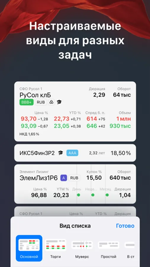 • СПИСКИ ОБЛИГАЦИЙ: Организуйте свой инвестиционный портфель так, как вам удобно, и следите за каждым из них, а также за интересными вам облигациями.