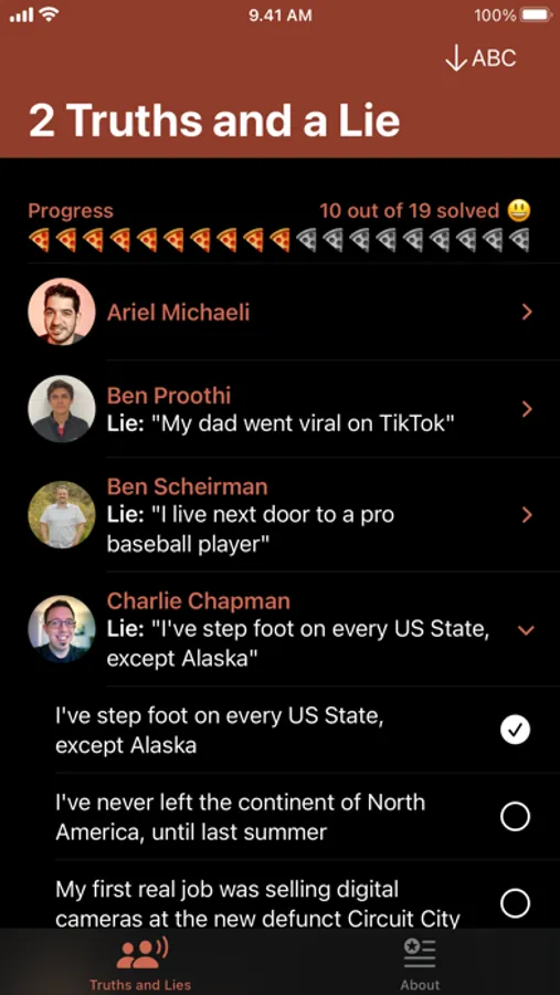 As the conference approaches, many of the speakers have participated in a series of podcast episodes, where they each shared 2 true statements and 1 false statement. With Deep Dish Lie, you can mark which statement you think is the lie, and keep track of the real answer when you talk to the speaker in person.