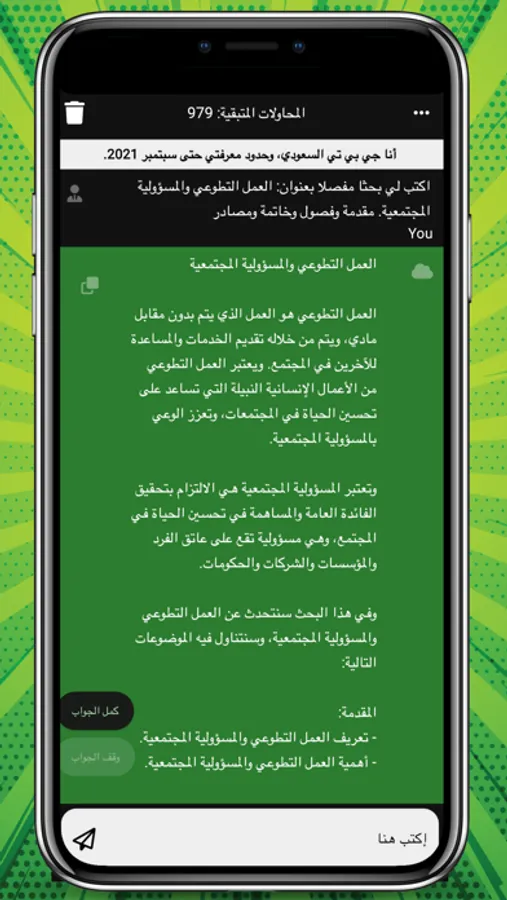14. يعتبر تطبيق "جي بي تي السعودي" مساعداً ذكياً وموثوقاً يساعد المستخدمين في مجموعة متنوعة من المهام اليومية والموضوعات المعرفية. سيتم توفير تحديثات مستمرة للتطبيق لضمان تحسين الأداء وتوسيع قاعدة المعرفة والقدرات.