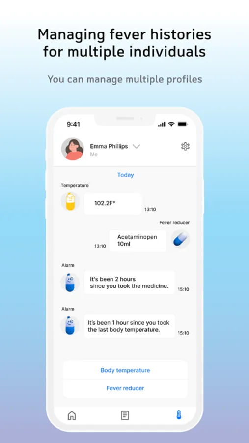 - Manage the health of your family members by adding their profiles to track their body temperature and fever reducer usage.
