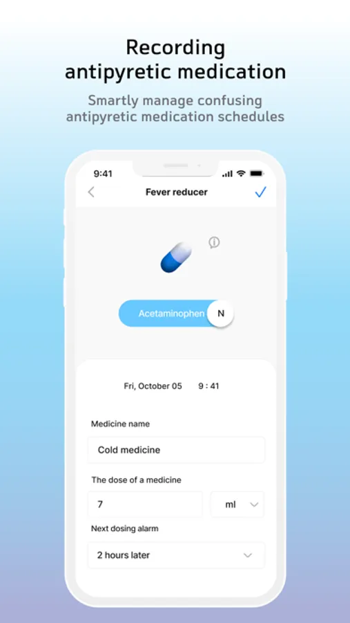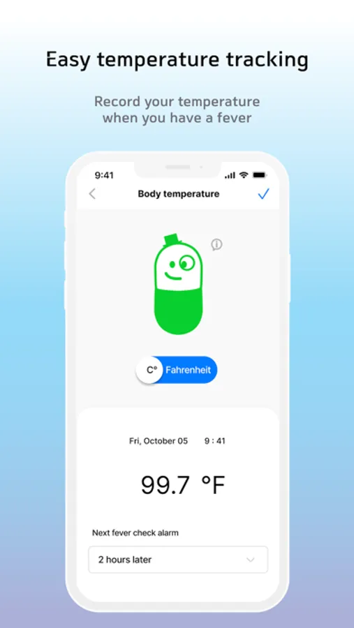 - Swiftly record your body temperature when you're feeling unwell or running a fever and receive timely reminders.