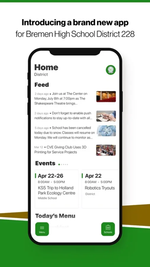 The event section shows a list of events throughout the district. Users can add an event to their calendar to share the event with friends and family with one tap.