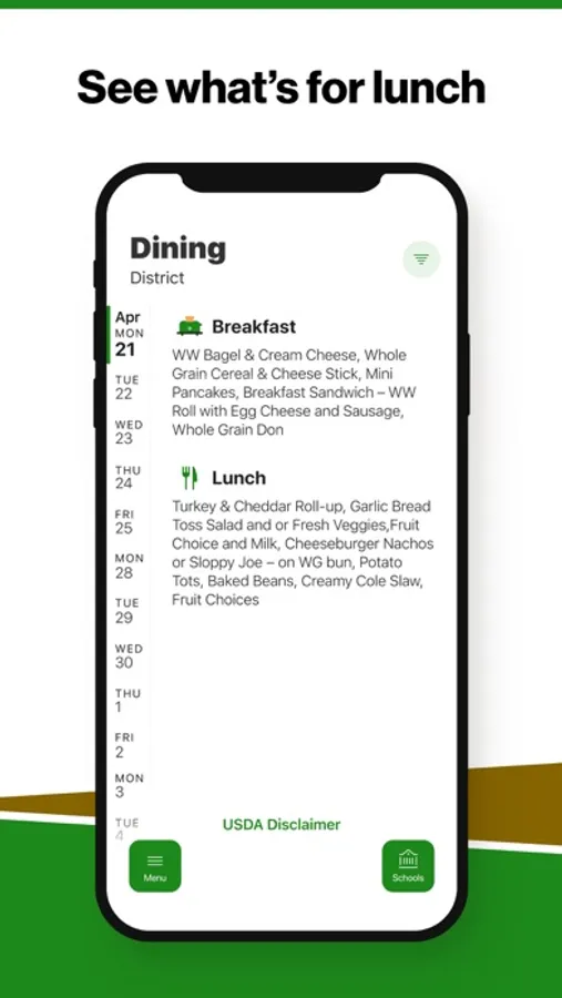 Within the dining section, you'll find an easy to navigate, weekly menu, sorted by day and meal type.