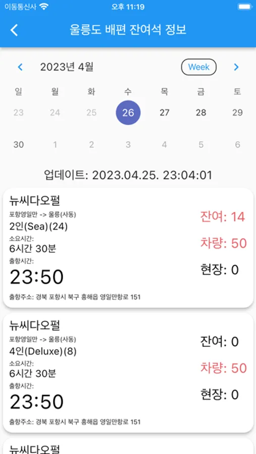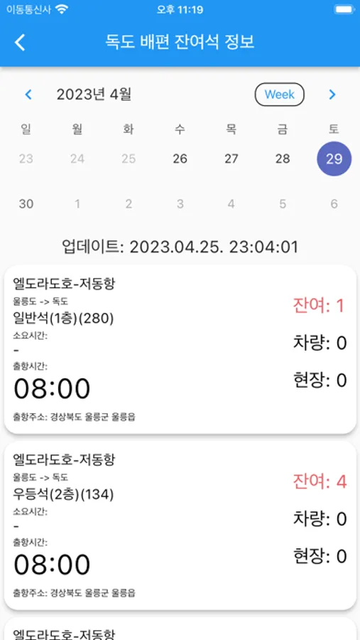 울릉도 및 독도행 배편의 실시간 빈자리 조회(1시간에 1번씩 업데이트)